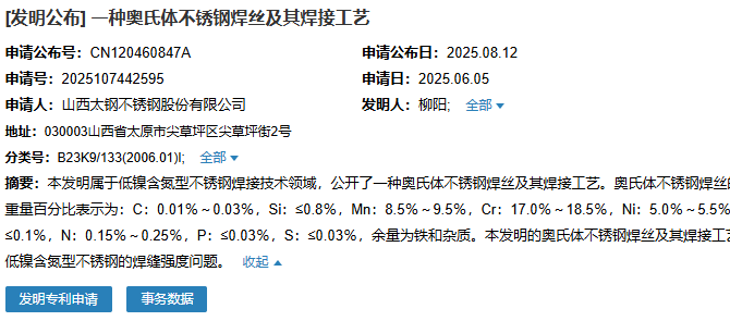 8月12日,山西太钢不锈钢股份有限公司成功申请一项名为“一种奥氏体不锈钢焊丝及其焊接工艺”专利,申请公布号为CN120460847A,申请日期为2025年6月5日。